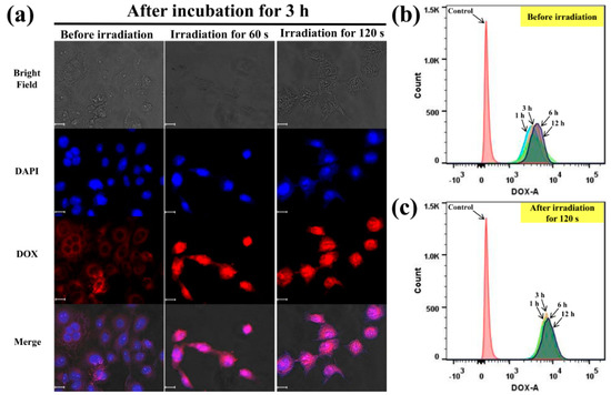 CLSM images of HeLa cells incubated with DOX/5-ALA-loaded A-PPG micelles at 3 h after irradiation. HeLa cells were stained with the nuclear marker DAPI (blue); conjugated DOX emits red fluorescence (λex = 480 nm). All scale bars in (a) represent 20 μm. Flow cytometric profiles of HeLa cells incubated with DOX/5-ALA-loaded A-PPG micelles and then (b) not irradiated or (c) irradiated for various periods of time.