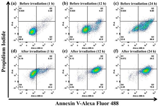 Flow cytometric analysis of the mechanisms of cell death induced by DOX/5-ALA-loaded A-PPG micelles in HeLa cells at 1, 12 and 24 h before irradiation (a–c) and after irradiation for 120 s (d–f). The numbers in the profiles indicate the percentages of cells in each quadrant.