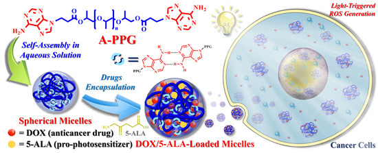 We previously established a series of SRPMs based on adenine-functionalized supramolecular micelles (A-PPG) containing nucleobase motifs and the difunctional oligomer polypropylene glycol (PPG) via a simple one-step chemical reaction. These carriers offer multiple advantages over conventional drug delivery systems, such as the ability to self-assemble into micelles in aqueous solution, extremely stable structures in serum rich-media, and well-controlled intracellular drug release and drug loading capacities due to the pH/temperature-sensitive hydrogen-bonded adenine moieties in the interior of the micelles [42,43,44,45]. Intriguingly, we discovered that these adenine-functionalized A-PPG micelles were selectively internalized into cancer cells in vitro, quickly released the encapsulated drug and significantly reduced the viability of the cancer cells. However, the same effects were not observed in healthy cells, as premature drug release was limited under normal physiological conditions [46,47]. Due to the existence of the self-complementary hydrogen-bonded adenine interactions, the drug-loaded micelles retained stable spherical micellar structures that restricted drug release. At 37 °C, 19% of the drug was released in the first 24 h, 23% after 48 h, with cumulative release of only 25% after 96 h [46]. Consequently, cumulative drug release from A-PPG micelles under normal physiological conditions would be unsatisfactory for drug delivery applications. Photosensitizers lead to the generation of high levels of localized intracellular ROS when activated by laser irradiation. Thus, we hypothesized that generation of ROS by an irradiated photosensitizer would enhance drug release from A-PPG micelles and provide a suitable strategy for synergistic chemo-photodynamic therapy.