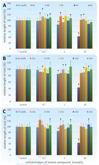 Effect of selected brassinosteroid derivatives on the inhibition of Arabidopsis root length. Seven-day-old Arabidopsis thaliana seedlings (Columbia ecotype, Col-0) were treated with DMSO as control/24epiBL/BR short side chain derivatives; (A)—amides, (B)—amines, (C)—ammonium hydrochlorides. For each treatment, more than 15 seedlings were analyzed in two biological repeats. Error bars represent SD. Asterisks represent significant changes (t-test); * represents p-value < 0.05, in comparison to control.