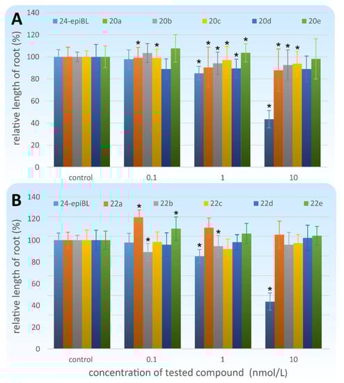 Several bioassays such as the first bean internode, root growth and rice lamina inclination have been developed to evaluate the growth-promoting activity of BR derivatives [36]. In this work, the activity of new BR analogues was evaluated using the Arabidopsis root sensitivity test because of its simplicity and high sensitivity for BRs. [27,28]. The characteristic effect of exogenously applied BRs on light-grown Arabidopsis is dose-dependent—BRs in higher concentrations cause inhibition of root growth; vice versa, low concentrations are stimulating [37,38,39]. The results obtained for 24-epiBL, which was used as a positive control, and the BR derivatives are shown in Figure 2, Figure 3 and Figure S21. The most active BR (24-epiBL) inhibited Arabidopsis root growth in 1 nM and higher concentrations. Most of the newly synthesized BR derivatives were not active, and only the long side chain derivatives 20a and 20c show a weak inhibitory effect in the concentration range, which was not confirmed using the higher tested concentration of 100 nM (Figure 3 and Figure S21). Compound 22b shows the same effect only at low concentrations; on the contrary, compound 8a shows weak inhibition up to the highest tested concentration of 100 nM (see Figure S21). On the other hand, in low concentrations (0.1 and 1 nM), a slight elongation of roots was observed for derivatives with a short side chain (8a, 8b, 8e and 16e) compared to the control. A similar trend was shown for dimethylammonium hydrochloride 22a and morpholinium hydrochloride 22e with a long side chain. For numerical values of the average, SD and p-value, see Table S2.
