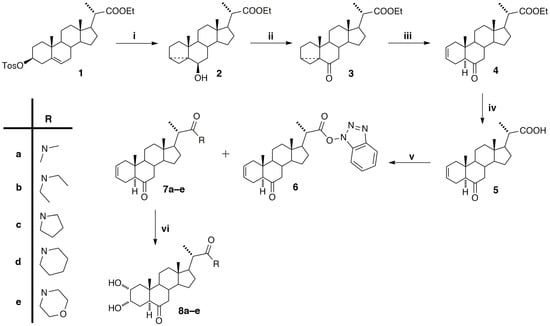 The synthesis of all nitrogen-containing compounds was divided into three groups—short chain amides (Scheme 1), short chain amines and ammonium chlorides (Scheme 2) and long chain derivatives (Scheme 3). The synthesis of amides with a short side chain started with the known tosylate 1 [33]. Other reaction steps correspond to standard brassinosteroid synthesis [3]. Firstly, hydroxy ester 2 is formed from tosylate, followed by oxidation with Jones reagent to oxo-ester 3. This ketone undergoes rearrangement to olefin 4. Hydrolysis of the ester group afforded carboxylic acid 5 that is suitable for amide formation. Five different secondary amines were used for the amidation reaction—dimethylamine, diethylamine, pyrrolidine, piperidine and morpholine. In all five cases, olefinic amides 7a–e were obtained in very good yield. However, activated ester 5 can also be isolated after 4–5 h of reaction. As the last reaction, we used Upjohn dihydroxylation to prepare five dihydroxy amides, 8a–e.