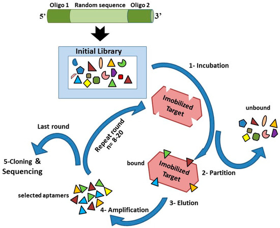 32]. The SELEX methodology remains the gold standard for the development of specific aptamers, and the process includes several rounds of amplification and enrichment that allow the evolution of aptamers with high affinity, specific to a given target, from a set of random oligonucleotides. Usually, negative selections (counterselections) are added to the methodology and allow the elimination of nonspecific sequences that also bind to similar or related targets [