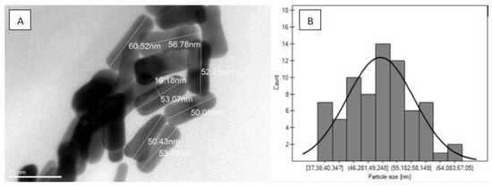 The morphology of synthesized gold nanorods was assessed by transmission electron microscopy. The average length of obtained nanorods reached about 50 nm (+/−6 nm) (Figure 1).