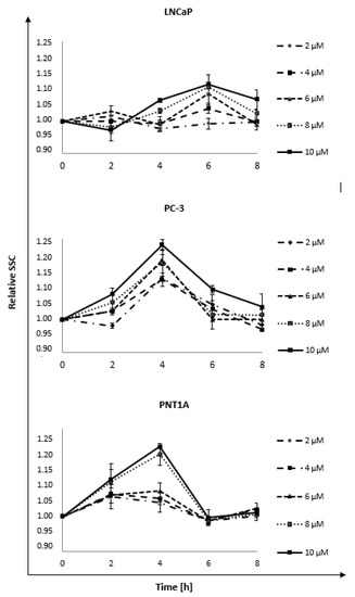 The nanorods interaction (uptake and surface adsorption) with LNCaP, PC-3, and PNT1A cell lines was determined based on the cytometric analysis of the SSC parameter reflecting cellular granularity. The measurement was made with the assumption that the more nanorods a cell absorbs, the more granular it will be. For this purpose, analysis was performed at four time points—2, 4, 6, and 8 h—for five concentrations of nanorods: 2, 4, 6, 8, and 10 μM (Figure 3). Those concentrations were chosen because of minimal cytotoxic effects on PNT1A cells. The obtained results showed concentration-dependent changes in relative granularity, indicating the internalization and adsorption of nanorods in both normal and cancer cells. We observed a noticeable increase in granularity up to 4 h (PC-3 and PNT1A) and 6 h (LNCaP), which was followed by its decrease. Presumably, this indicates the removal of nanorods from the inside of the cells after prolonged incubation. The LNCaP line showed the highest maximum granularity at 6 h, which was followed by a less pronounced decrease than that observed in two other cell lines. For LNCaP, the normalized SSC increased by 0.11 ± 0.02 at 6 h for the highest concentration. In the case of the PC-3 line, the highest granularity was observed at a 4-h time point, with an increase of 0.22 ± 0.02 compared to control. Increasing values in granularity could be observed after using higher concentrations of nanorods. The PNT1A line had a very similar dynamic interaction as the PC-3 line. Maximum SSC occurred after 4 h, the increase was 0.19 ± 0.01 compared to control, while in 6 h, it decreased drastically. The increase in granularity was observed after incubation with 8 μM and 10 μM GNRs.
