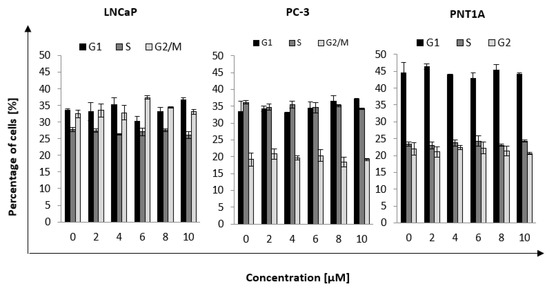 The next step was to determine the percentage of cells in a given phase of the cell cycle after incubation with nanorods for times at which maximum uptake was observed. The selected time points were: LNCaP, 6 h; PC, 4 h; and PNT1A, 4 h (Figure 4). Five concentrations of nanorods were selected based on toxicity results. Less toxic concentrations were chosen, as the goal was to measure the enhancement of the radiation effect and not the toxicity of the nanorods. We observed an increase in the number of LNCaP cells in the G2 phase of 5% ± 0.9% for a concentration of 6 μM compared to the control. In the case of the PC-3 and PNT1A cell lines, no discernible differences in the cell cycle distribution could be observed.