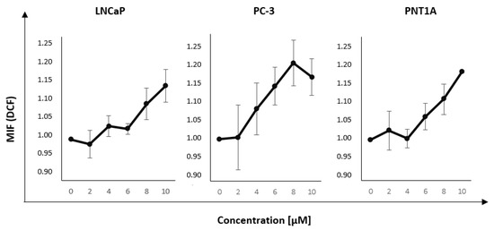 Using the results determining the toxicity of nanorods and the time point at which the uptake is the highest (LNCaP—6 h, PC-3—4 h, PNT1A—4 h) after incubation with GNR, the measurement of ROS level was performed. The aim was to measure the level of reactive oxygen species after incubation with GNR in the concentration of range of 2–10 μM. The results are presented in Figure 5. An increase in the mean fluorescence intensity indicated a higher level of reactive oxygen species formed. The obtained results showed an increased level of reactive oxygen species after incubation with nanorods; however, the changes were not statistically significant. We observed that incubation with GNR at higher concentrations resulted in higher ROS level in all three cell lines.