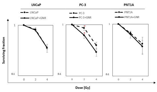 Survival curves after irradiation with 2 and 4 Gy doses of cells previously incubated with 6 μM GNR for a time determined by the highest value of nanorods absorption by selected cell lines. Survival curves for LNCaP after 6 h of incubation time, for PC-3 after 4 h of incubation time, and for PNT1A after 4 h of incubation time. Values with red “*” mean the only statistically significant difference (p < 0.05) between values in the point of 2 Gy. The values presented in the graph are the mean of the obtained results, and the deviation is the standard deviation. The experiment was performed in triplicate.