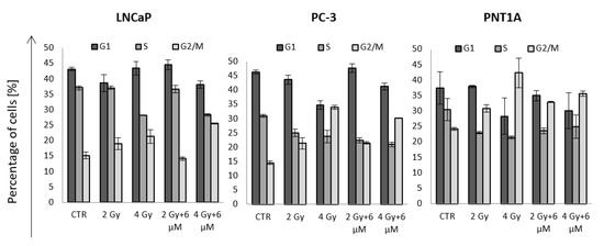 The percentage of cells in the G1, S, and G2 phases of the cell cycle after treatment with nanorods and radiation. The cells were irradiated with 2 and 4 Gy doses following incubation with nanorods at a concentration of 6 μM. LNCaP was irradiated after 6 h of incubation, PC-3 was irradiated after 4 h of incubation, and PNT1A was irradiated after 4 h of incubation. The values presented in the graph are the mean of the obtained results, and the deviation is the standard deviation. The experiment was performed in triplicate.