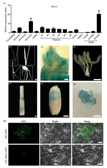 Expression pattern of OsMre11 gene in rice. Expression pattern of OsMre11 gene in rice. (a) Expression level of OsMre11 gene in 7-day-old seedling, 60-day-old root, 60-day-old stem, 60-day-old leaf, callus, panicles (P1: 0–3 cm spikelet; P2: 3–5 cm spikelet; P3: 5–10 cm spikelet; P4: 10–15 cm spikelet; P5: 15–22cm spikelet; P6: 22-30cm spikelet), ovary, anther, and seeds (5DAP: 5 days after pollination; 10DAP: 10 days after pollination; 30DAP: 30 days after pollination). (b–g) GUS (β-Galactosidase) expression pattern in different tissues and organs. GUS expression in 7-day-old seedling after germination (b), shoot apical meristem (c), pistil and stamen (d), 60-day-old stem (e), mature seed (f), transgenic positive callus (g). (b,d–g) Scale bars represent 1 mm. (c) Scale bar represents 0.1 mm. (h) Subcellular localization of OsMre11 in tobacco epidermal cells. The 35S::GFP was used as a negative control. Scale bars represent 64 µm.