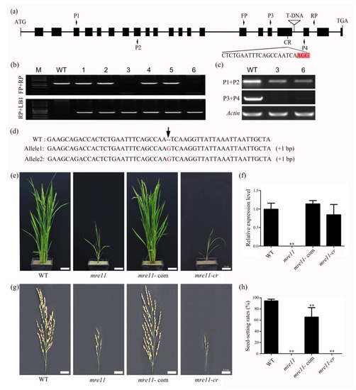 To investigate the function of OsMre11 in rice, the T-DNA mutant was first identified, and the primers were designed to identify the precise mutation position. The result showed that the T-DNA insertion site of the mre11 was located in the 19th intron of OsMre11 (Figure 2a). Through genotypic identification in the progenies, we obtained wild type (WT), heterozygous (HZ), and homozygous (HM) plants (Figure 2b) and found that there was no OsMre11 expression near T-DNA insertion in the 3rd and 6th homozygous plants by semi-quantitative PCR (Polymerase Chain Reaction) technique (Figure 2c). Furthermore, the phenotype characteristics of all genotypes were observed, and no developmental defects appeared in WT or heterozygote plants during vegetative growth, whereas the homozygous plants of the mre11 mutant were dwarf (Figure 2e). To verify that the dwarf phenotype was caused by the mutation of Mre11 in rice, the complementation assay was performed by transforming the full-length genomic fragment of OsMre11 into the mre11 callus, forming transgenic plants. We found that vegetative growth and gene expression of the complementary plants (mre11-com) returned to normal levels (Figure 2e,f). Simultaneously, the CRISPR/Cas9 (clustered regularly interspaced short palindromic repeats/Cas9) system was used to create another mutant mre11-cr. In this mutant, the editing site was located in the 19th exon close to the T-DNA (Figure 2a), and sequencing of PCR amplified OsMre11 genomic DNA from rice transgenic positive plants showed that each chain of DNA inserted a guanine base, indicating it was a homozygous mutant (mre11-cr) (Figure 2d). Although the OsMre11 expression level in the mre11-cr mutant was close to rice WT and the complementary plants (Figure 2f), the phenotype analysis showed that the development characteristics of mre11-cr were similar to the T-DNA mre11 mutant (Figure 2e,g). Because mre11-cr had a point mutation, the mutant had no effect on its gene expression. These results indicate that OsMre11 is essential for normal vegetative growth and development in rice.