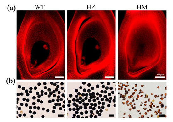 Moreover, the seed-setting rates were up to 94.61% in the WT plants and 65.55% in the mre11-com T2 generation plants, while the seeds of the mre11 and mre11-cr mutants were completely aborted (Figure 2h,g). The embryo sac transparency and KI-I2 staining showed that the female and male gametophytes of HZ plants had no obvious abnormality, but those of mre11 (HM) were completely aberrant, leading to the aborted seeds (Figure 3a,b). These results suggest that OsMre11 plays a crucial role in the development of female and male gametophytes.