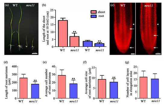 The shoots and roots of the mre11 seedlings that germinated for 10 days were significantly shorter than those of the WT seedlings (Figure 4a). The average length of shoots and roots was 61.18% and 42.29% shorter than the WT seedlings, respectively (Figure 4b). To further observe the cell size and number of the root apical meristem (RAM), we performed the root tip transparent and staining assay in 10-day-old seedlings (Figure 4c), and found that the RAM of the mre11 mutant was 30.36% shorter in length (Figure 4d), 36.75% less in cell number (Figure 4e), and 14.39% smaller in cell size (Figure 4f) than the WT seedlings. However, there was no difference in the number of cell layers in the elongation zone (Figure 4g). These results imply that the cell division activity in the mre11 mutant is inhibited.