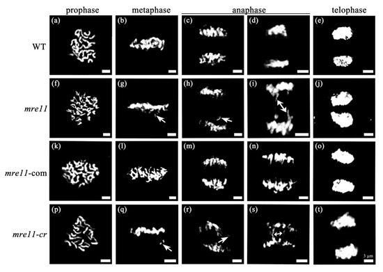 To investigate the defect in cell division in the mre11 mutant, the mitotic chromosome morphology and segregation in the root tip cells were analyzed. As shown in Figure 5, chromatin was condensed to form chromosomes in prophase (Figure 5a,f,k,p), and the chromosomes of WT and mre11-com were regularly arranged on the equatorial plate in metaphase (Figure 5b,l), while there were many chromosomal fragments near the equatorial plates in the mre11 and mre11-cr mutants (Figure 5g,q). In anaphase, sister chromatids of chromosomes moved to the two poles of cells, while some cells contained lagging chromosomal fragments and chromosomal bridges in the mre11 and mre11-cr but not in WT and mre11-com (Figure 5c,d,h,i,m,n,r,s). In telophase, two daughter cells were generated (Figure 5e,j,o,t). The chromosome abnormal ratio reached up to 25.86% (n = 58) in the mre11 and 34.78% (n = 23) in the mre11-cr seedlings, while there was no abnormities in WT (n = 76) and mre11-com (n = 41) seedlings. The results indicate that OsMre11 is required for ensuring well-balanced mitosis in rice growth and development.