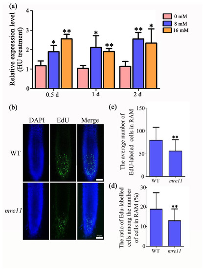 A single cell cycle includes two stages, interphase and a mitotic division phase. Interphase is an active material preparation stage for mitosis, completing the replication of DNA molecules and the synthesis of related proteins. Interphase is divided into G1, S, and G2 phases, and DNA replication is mainly in S phase. To elucidate the role of OsMre11 in the cell cycle, DNA replication inhibitors hydroxyurea (HU) and aphidicolin were applied to treat the 10 DAG seedlings. The results showed that the expression of OsMre11 increased with the HU treatment (Figure 6a), but no obvious change was observed with the aphidicolin treatment (Figure S4a,b). Ethynyl deoxyuridine (EdU), an analog of thymidine, can be incorporated into chromosomes during DNA replication, and it is often used to label S-phase cells [37]. A staining assay with EdU showed that there was an obviously lower proportion of EdU-labeled cells in the RAM of mre11 than those in WT (Figure 6b,c), and the ratio of EdU-labeled cells among the number of cells in RAM of the mre11 was significantly lower than that of WT (Figure 6d), indicating that S-phase DNA replication is impaired in the mre11 seedlings. Therefore, OsMre11 is a critical factor for mitotic DNA replication in rice.