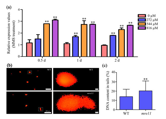 To prove whether the mutation of OsMre11 was involved in the DNA damage response, the WT seedlings were treated with methyl methanesulfonate (MMS) and mitomycin C (MMC) to detect the expression level of OsMre11. MMS and MMC are both DNA damage reagents. MMS can only cause double strand breaks, while MMC can cause single strand breaks or double strand breaks. The results showed that the expression of OsMre11 was up-regulated after treatment with the MMS reagent (Figure 7a), but there was no change after treatment with the MMC reagent (Figure S4c,d), suggesting that OsMre11 has a higher sensitivity to MMS and may be involved in DSB repair. To verify this finding, we conducted a comet assay, also known as single-cell gel electrophoresis, to evaluate the strength of genotoxicity by detecting the degree of DNA strand damage (Figure 7b). The comet assay can effectively detect and quantify the extent of DNA single- and double-strand breakage in cells [38]. The more severe the DNA was damaged, the more fragments were produced, the more DNA breaks migrated under the same electrophoresis conditions, and the longer the migration distance. CometScore software calculation showed that DNA content in tails of the mre11 mutant was nearly 1.44 times of WT (Figure 7c), indicating that OsMre11 plays an important role in DNA DSB repair.
