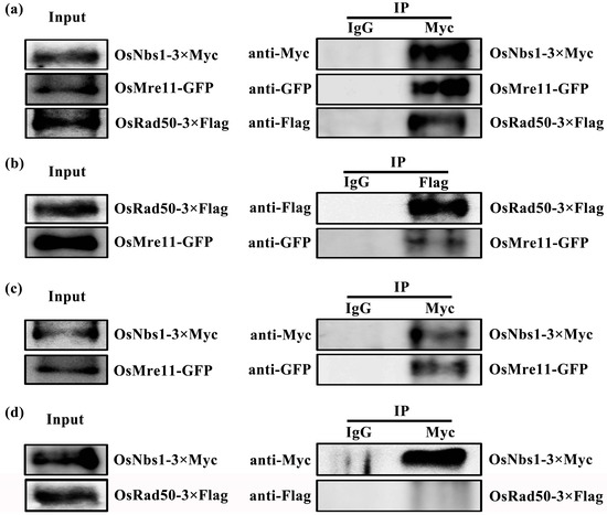 Subsequently, we performed a bimolecular fluorescence complementation (BiFC) assay in tobacco leaves using a transient transformation technique and detected that the YFP signals in transformed leaf cells co-expressing the constructs OsMre11-YN and OsMre11-YC, OsRad50-YN and OsRad50-YC, OsMre11-YN and OsRad50-YC, OsMre11-YN and OsNbs1-YC, OsRad50-YN and OsMre11-YC, and OsNbs1-YN and OsMre11-YC (Figure S6). The results showed that OsMre11 and OsRad50 can interact with themselves (Figure S6b,d), but OsNbs1 cannot (Figure S6f). OsMre11 can interact with OsRad50 and OsNbs1 (Figure S6g–i,k), but OsRad50 cannot interact with OsNbs1 (Figure S6j,l). To further verify the interactive relationship between OsMre11, OsRad50, and OsNbs1, coimmunoprecipitation tests and analysis were conducted (Figure 8). When the three fused proteins, OsMre11-GFP, OsRad50-3×Flag, and OsNbs1-3×Myc were transiently co-expressed in tobacco leaf cells, the OsMre11-GFP and OsRad50-3×Flag fusion proteins could be coimmunoprecipitated with OsNbs1-3×Myc (Figure 8a). When two fused proteins, OsMre11-GFP and OsRad50-3×Flag were transiently co-expressed in tobacco leaf cells, OsMre11-GFP could be coimmunoprecipitated with OsRad50-3×Flag (Figure 8b). When OsMre11-GFP and OsNbs1-3×Myc were transiently co-expressed in tobacco leaf cells, OsMre11-GFP could be coimmunoprecipitated with OsNbs1-3×Myc (Figure 8c). However, when OsRad50-3×Flag and OsNbs1-3×Myc were transiently co-expressed in tobacco leaf cells, OsRad50-3×Flag could not be coimmunoprecipitated with OsNbs1-3×Myc (Figure 8d). Therefore, the results suggest that OsMre11 may act as an intermediate bridge to connect OsRad50 and OsNbs1, forming the Rad50-Mre11-Nbs1 complex to function together in rice growth and development.
