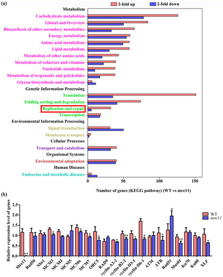 RNA sequencing analysis and verification of gene expression in rice WT and the mre11 seedlings. RNA sequencing analysis and verification of gene expression in rice WT and the mre11 seedlings. (a) The number of 2-fold up and down-regulated genes in the Kyoto Encyclopedia of Genes and Genomes (KEGG) pathway (WT vs. mre11). Many genes related to replication and repair had changed significantly in the mre11 compared with WT (in the red frame). (b) The relative expression level of genes related to DNA replication, cell cycle, and DNA repair in WT and the mre11 seedlings. The asterisks represent a statistically significant difference according to Student’s t-test (*, 0.01< p <0.05; **, p < 0.01).