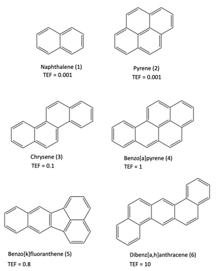 - Andersson, J.T.; Achten, C. Time to Say Goodbye to the 16 EPA PAHs? Toward an Up-to-Date Use of PACs for Environmental Purposes. Polycycl. Aromat. Compd. 2015, 3, 330–354. [Google Scholar] [CrossRef] [PubMed]
