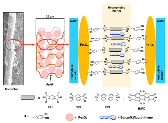 Fibre formation was dependent on the size of PAH—particularly on the number of double bonds of each PAH molecule [18]—and on the geometry and electronic properties of electron-deficient diimides anchored on the magnetite nanoparticle.