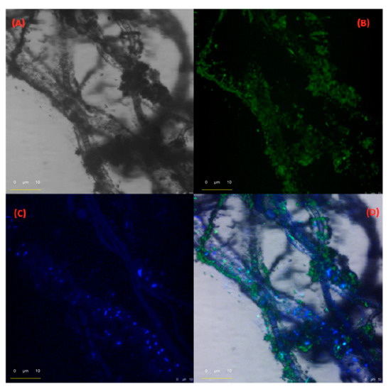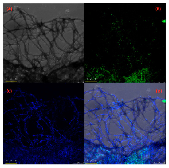 Figure 3 shows a composition of photomicrographs of DB[ah]A@FeNP-BDI-DA network-growing filamentous fibres, performed with the optical microscope (Figure 3A), and with the confocal fluorescent microscope, with a rhodamine laser at λexc = 540 nm (Figure 3B–D). The distribution of the host and guest in the network is highlighted by the different fluorescent colouration when using different wavelengths for the excitation of the sample. Figure 3B,C shows, preferably in green and blue, the distribution of the FeNP-BDI-DA nano receptor in the network and the distribution of DB[ah]A, respectively. Finally, Figure 3D is the result of superimposing of all photomicrographs.