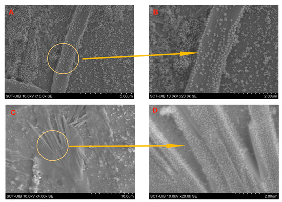(A,B) SEM micrographs showing microfibres assembled between FeNP-BrPDI-DA and BKF. (C,D) FeNP-BrPDI-DA and BHA, in aqueous media.