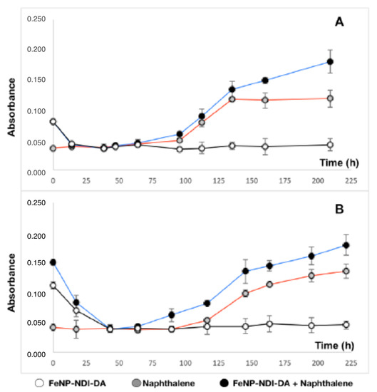 Growth (Absorbance, 595 nm) of S. aestuarii 357 with naphthalene (0.1% w/v) as unique carbon and energy source supplemented with 100 mg/mL (A) and 200 mg/mL (B) of FeNP-NDI-DA. Growth values are average and SD of three different experimental replicates.