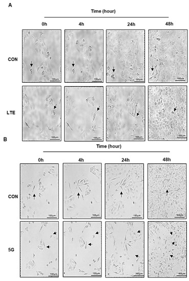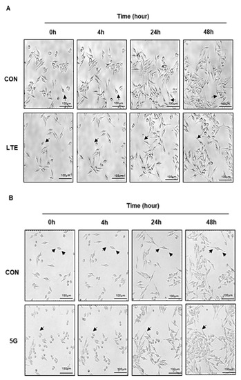 Effects of EMFs on the dendrite formation in co-cultured cell lines. MNT-1 and HaCaT cells were co-cultured in 8-well chamber and then exposed to either LTE or 5G for 4 h per day. (A) Dendrite formation changes on MNT-1/HaCaT co-culture cells after LTE exposure. (B) Dendrite formation changes on co-culture cells after 5G exposure. Black arrows indicated the representative dendrite formation as the cultivation time continues.