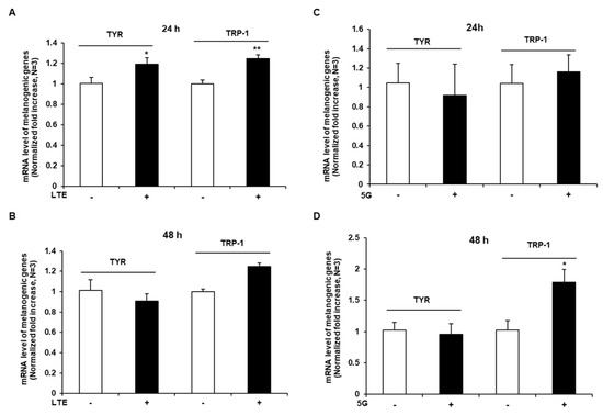 Tyrosinase (TYR) and tyrosinase-related protein 1 (TRP-1) are crucial melanogenic enzymes in melanin synthesis. Here, murine melanoma cells, B16F10, were exposed to either LTE or 5G for 4 h per day. Then, 24 or 48 h after the exposure, the cells were lysed using Trizol, and mRNA expression levels of TYR and TRP-1 were determined using real-time polymerase chain reaction (real-time-PCR). As a result, significant but only slight increases in the expression of TYR and TRP-1 were observed (Figure 4).