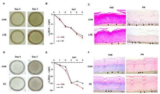 MelanoDerm™, a pigmented human skin model, exhibits in-vivo-like morphological characteristics of human epidermis and has been widely used to study the physiological mechanisms of skin pigmentation. Normally, MelanoDerm™ becomes increasingly pigmented as the cultivation days continue. After continuous exposure to LTE at 8 W/kg for 5 days, there was no difference in visual evaluation (Figure 5A) and image analysis for brightness (Figure 5B). The tissues were stained with hematoxylin and eosin (H&E) and Fontana–Masson (FM) melanin stain on the last day of the experiment (Figure 5C), which confirmed that there was little difference between the control and the LTE-exposed sample. To confirm the effect of 5G on skin pigmentation, MelanoDerm™ was exposed to 5G at 10 W/m2 for 5 days. The results revealed that there were no significant changes in pigmentation in visual evaluation (Figure 5D) and image analysis for brightness (Figure 5E). H&E and FM staining also showed that the quantity of melanin was not increased (Figure 5F).