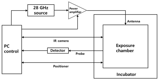 The 5G exposure system for 28 GHz experiments was developed for in vitro studies [25]. The “all-in-one” system integrates every system component into a single unit. The exposure chamber is designed based on the field uniformity [24]. Actual uniformity inside the chamber was checked based on planar measurements. Temperature regulation to suppress thermal effects during exposures can also be achieved by using the measured cell temperatures based on the infrared (IR) camera via real-time feedback, and controlling the air-flow rates of the incubator during high-power experiments. A personal computer (PC) can record and display all the experimental data during exposures. A graphical user interface (GUI) of the control software (SW) enables us to easily define all the operating conditions as well.