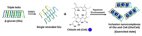 Typically, Glu has triple-helix structures in aqueous solution, which change into single strands upon solubilization at temperatures over 150 °C, or with NaOH or dimethyl sulfoxide (DMSO). Interestingly, they can re-assemble the triple-helix structure when exposed to an aqueous environment again [33,34]. Based on this fact, we prepared photoactivatable Glu/Ce6 nanocomplexes. For the synthesis of Glu/Ce6 nanocomplexes, Glu was dissolved in DMSO with heating at 60 °C to release single spiral structures from triple-spiral structures due to the loss of hydrophilicity and hydrogen bonds [35]. Then, hydrophobic Ce6 was added to the Glu solution and stirred for 3 h. The mixture was then added into a large amount of water. On exposure to an aqueous environment, the Glu triple structures may be reformed with the Ce6 molecules loaded into them to form Glu/Ce6 inclusion nanocomplexes (Figure 1).