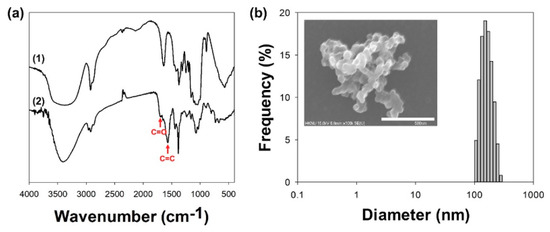 Characterizations of Glu/Ce6 nanocomplexes. (a) FTIR spectra of (1) Glu and (2) Glu/Ce6. (b) Particle size distribution of Glu/Ce6. Inset SEM image: the morphology of Glu/Ce6. Scale bar: 500 nm.