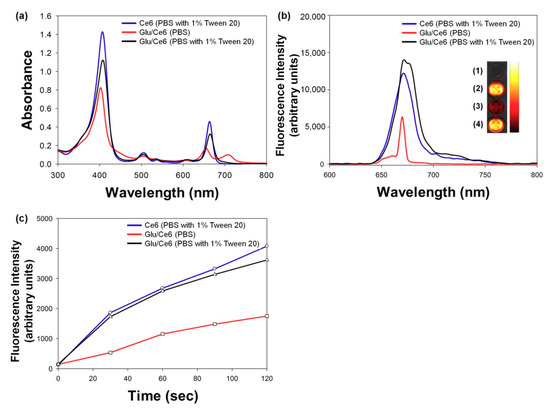 To confirm whether the prepared Glu/Ce6 forms nanosized particles, UV/Vis absorbance (from 300 to 800 nm) and fluorescence spectra (from 600 to 800 nm) of Glu/Ce6 (equivalent 5 μM Ce6) diluted in PBS (pH 7.4) were recorded with a UV/Vis spectrophotometer (Neo-S450, Neogen, Sejong, Korea) and fluorescence spectrometer (FS-2, Scinco, Korea), respectively. For comparison, free Ce6 (5 μM) and Glu/Ce6 (equivalent 5 μM Ce6) solutions were prepared, using 1% Tween 20-containing PBS, and their UV/Vis absorbance and fluorescence spectra were also monitored. In addition, the fluorescence images of these three solutions were acquired by using a small animal imaging equipment (In Vivo Smart-LF, VIEWORKS, Anyang, Korea).