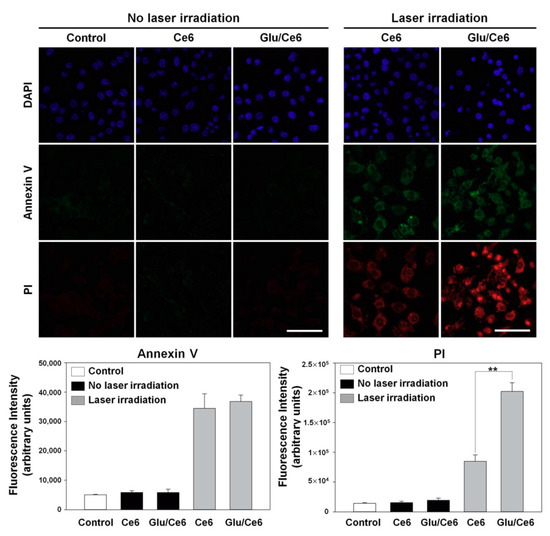 To evaluate apoptosis induction after laser irradiation, macrophages (1 105 cells/mL) were seeded into a 4-well chamber and allowed to adhere for 24 h. Atherogenic foam cells were prepared by treating LPS and LDL for 24 h as described above. The cells were exposed to free Ce6 (5 µM) or Glu/Ce6 (equivalent of 5 µM Ce6) for 2 h. After carefully washing with PBS, they were irradiated with or without an NIR laser (670 nm, 50 mW/cm2) for 1 min. Then, the cells were stained with AV/PI for 5 min according to the manufacturer’s instructions. Next, the cells were washed with the 1× binding buffer, fixed with paraformaldehyde (4%) for 30 min, and washed with PBS. The nuclei of the cells were counterstained with a mounting solution containing DAPI. Apoptosis induction was observed under a confocal microscope (LSM 700, Carl Zeiss, Germany).