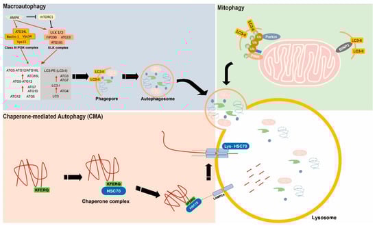 Autophagy is a highly evolutionarily conserved process that meets metabolic demands and homeostasis through an intracellular recycling system or self-degradation [14]. The autophagic process is induced under diverse cellular stress conditions, such as starvation, cellular damage, and the production of dysfunctional proteins [8]. Autophagy is classified into macroautophagy, microautophagy, and chaperone-mediated autophagy (CMA). Macroautophagy is involved in the isolation of cytoplasmic cargo into phagophores, which induces the formation of autophagosomes composed of double membrane vesicles. Then, autophagosomes fuse with lysosomes to form autolysosomes and carry out degradation and recycling [15]. Microautophagy is a direct autophagic process involving the invagination of cytosolic components into the lysosomal membrane by the capturing of cargo [16]. CMA is a selective autophagy, in which cargo complexed with chaperone proteins (such as HSC70) is recognized and translocated across the lysosomal lumen by a lysosomal membrane receptor, such as lysosomal-associated membrane 2A (LAMP-2A) (Figure 1) [17].