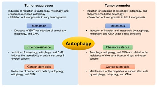 Autophagy works to maintain cellular homeostasis and degrade damaged proteins and organelles. In addition, many studies have suggested that autophagy is related to an important role in several diseases, although it is currently unclear whether autophagy plays a protective or inhibitory role [41]. In cancer, autophagy has a dual role in tumor promotion and suppression. Autophagy has an inhibitory function through the elimination of damaged cells and organelles during tumor initiation and malignant transformation [42]. In addition, autophagy has a protective function by meeting the metabolic and energy production demand of cancer cells during cancer development (Figure 2) [43].