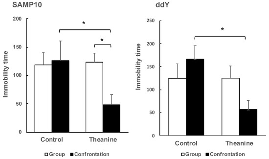 It was not possible to compare SAMP10 and ddY mice because the optimal observation time depended on the mouse strain, but it was possible to compare the effects of confrontational housing on depression-like behavior within the same strain. There was no significant difference between group and confrontational housing in the control mice, and the presence or absence of theanine intake had no effect on immobility time. However, immobility time was shortened only in mice that ingested theanine under confrontational housing.