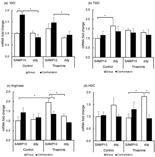 Effect of theanine intake on mRNA expression of SAMP10 and ddY mice under group or confrontational housing. (a) Indoleamine-2,3-dioxygenase (IDO); (b) Tryptophan-2,3-dioxygenase (TDO); (c) Arginase; (d) Histidine decarboxylase (HDC). Mice were housed confrontationally for one month after single housing for one month (closed column). Group-housed mice were kept in a group of four for two months (open column). Mice ingested theanine (20 µg/mL, 6 mg/kg) or water (control) for two months (n = 4, *, p < 0.05).