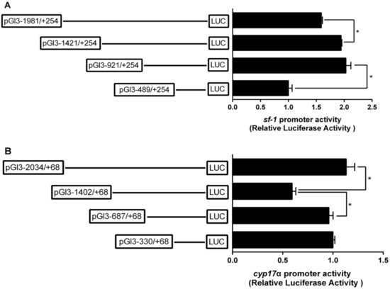 2.2. The Relative Luciferase Activity of 5’-Deletion Assay of the Regions of sf-1 and cyp17α Promoters