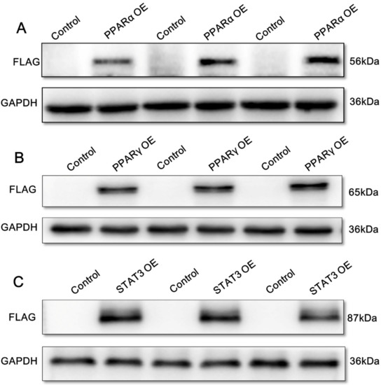 Overexpression (OE) of yellow catfish PPARα, PPARγ, and STAT3 in HEK293T cells after Western blot analysis using FLAG antibody. (A) PPARα over-expression (OE); (B) PPARγ OE; (C) STAT3 OE. GAPDH represents glyceraldehyde-3-phosphate dehydrogenase. (n = 3 represents three independent biological experiments).