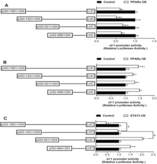 Assays of sf-1 promoter activities by mutagenesis on predicted PPARα, PPARγ, and STAT3 binding sites at 24 h. (A) Site mutagenesis of PPARα on −1981/+254 sf-1 promoter; (B) Site mutagenesis of PPARγ on −1981/+254 sf-1 promoter; (C) Site mutagenesis of STAT3 on −1981/+254 sf-1 promoter. Values are presented as mean ±SEM (n = 3 independent biological experiments). Asterisk (*) indicates significant differences between PPARα, PPARγ, and STAT3 overexpression and the control (p < 0.05). Hash symbol (#) indicates significant differences between two 5′ unidirectional deletion plasmids under the same treatment (p < 0.05).