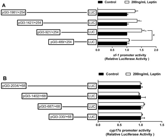 5’ unidirectional deletion assays for sf-1 (A) and cyp17α (B) promoters after 200 ng/mL leptin treatment for 24 h. Values showed the ratio of activities of firefly to Renilla luciferase, normalized to the control. Results were presented as mean ± SEM (n = 3 independent biological experiments). Asterisk (*) indicates significant differences between two treatments in the same plasmid (p < 0.05). Hash symbol (#) indicates significant differences between two 5′ unidirectional deletion plasmids under the same treatment (p < 0.05).