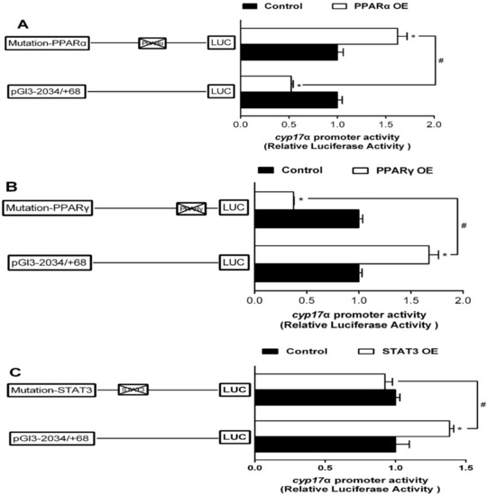 Assays of cyp17α promoter activities of mutagenesis on predicted PPARα, PPARγ, and STAT3 binding sites at 24 h. (A) Site mutagenesis of PPARα on −2034/+68 cyp17α promoter; (B) Site mutagenesis of PPARγ on −2034/+68 cyp17α promoter; (C) Site mutagenesis of STAT3 on −2034/+68 cyp17α promoter. Values are presented as mean ± SEM (n = 3 independent biological experiments). Asterisk (*) indicates significant differences between PPARα, PPARγ, and STAT3 overexpression and the control (p < 0.05). Hash symbol (#) indicates significant differences between two 5′ unidirectional deletion plasmids under the same treatment (p < 0.05).