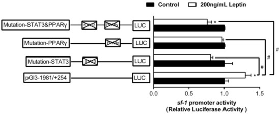 Assays of sf-1 promoter activity of site mutagenesis on predicted PPARγ and STAT3 after leptin treatment at 24 h. Values are presented as mean ± SEM (n = 3 independent biological experiments). Asterisk (*) indicates significant differences between different treatments in the same plasmid (p < 0.05). Hash symbol (#) indicates significant differences between different 5’ unidirectional deletion plasmids under the same treatment (p < 0.05).