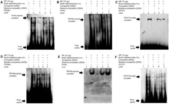 EMSA analysis of predicted PPARα, PPARγ, and STAT3 binding sf-1 and cyp17α promoters. (A) −413/−396 bp PPARα binding site of sf-1 (sf-1-PPARα); (B) −1396/−1388 bp PPARγ binding site of sf-1 (sf-1-PPARγ); (C) −1106/−1096 bp STAT3 binding site of sf-1 (sf-1-STAT3); (D) −881/−864 bp PPARα binding site of cyp17α (cyp17α-PPARα); (E) −89/−70 bp PPARγ binding site of cyp17α (cyp17α-PPARγ); (F) −1669/−1660 bp STAT3 binding site of cyp17α (cyp17α-STAT3). NP represents nuclear protein.