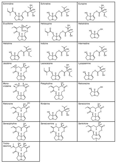 - Mulder, P.P.J.; Lopez, P.; Castellari, M.; Bodi, D.; Ronczka, S.; Preiss-Weigert, A.; These, A. Occurrence of pyrrolizidine alkaloids in animal- and plant-derived food: Results of a survey across Europe. Food Addit Contam Part. A Chem Anal. Control. Expo. Risk Assess. 2018, 35, 118–133. [Google Scholar] [CrossRef]