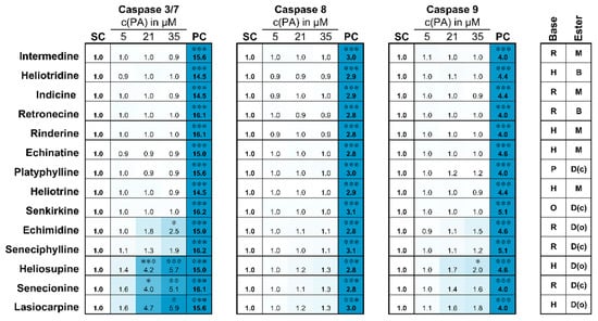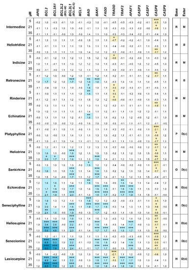 - Waizenegger, J.; Braeuning, A.; Templin, M.; Lampen, A.; Hessel-Pras, S. Structure-dependent induction of apoptosis by hepatotoxic pyrrolizidine alkaloids in the human hepatoma cell line HepaRG: Single versus repeated exposure. Food Chem. Toxicol. 2018, 114, 215–226. [Google Scholar] [CrossRef]