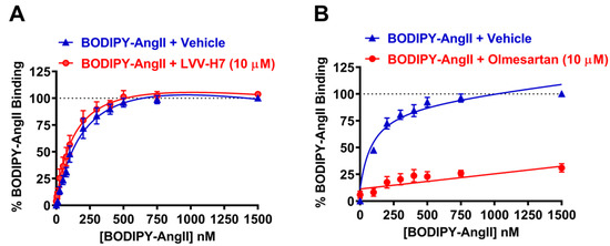 Saturation binding of BODIPY-angiotensin II (AngII) to AngII type 1 receptor (AT1R) using NanoBRET assay in live HEK293FT cells. HEK293FT cells transiently expressing Nluc-AT1R (NanoBRET donor) were first treated with 10 μM LVV-H7 or vehicle (A) or 1 μM olmesartan medoxomil or vehicle (B) for 20 min at 37 °C. Then, cells were incubated with increasing doses of BODIPY-AngII (NanoBRET acceptor) for 40 min at 37 °C before BRET signals were measured. Data are presented as % BODIPY-AngII binding by setting 100% as the maximal NanoBRET signal obtained with BODIPY-AngII in the absence of LVV-H7 (A) or olmesartan medoxomil (B). Data are mean ± SEM of four (A) or three (B) independent experiments performed in duplicate.