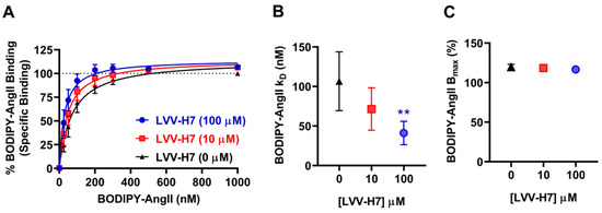 We previously showed a positive allosteric modulation of AT1R activity and signaling by LVV-H7 in HEK293 cells [14]. In this study, we examined the effect of LVV-H7 on the binding of AngII on AT1R using NanoBRET technology in real-time and intact cells as previously reported [15]. First, we performed steady-state saturation binding experiments with BODIPY-labelled AngII (BODIPY-AngII) in the absence or presence of 10 μM of LVV-H7. As shown in Figure 1A, LVV-H7 did not compete for binding with BODIPY-AngII, in contrast to the ~75% displacement of binding observed when treated with the competitive AT1R antagonist olmesartan medoxomil (Figure 1B). As Figure 1A appeared to show a small increase in binding affinity of BODIPY-AngII in the presence of LVV-H7, we investigated this further by generating BODIPY-AngII-specific binding curves in the presence of increasing concentrations of LVV-H7 (Figure 2). Here we found that LVV-H7 significantly potentiated the binding of BODIPY-AngII (mean KD ± SEM: 106.6 ± 37.1 nM at 0 μM LVV-H7 vs. 41.2 ± 14.7 nM at 100 μM LVV-H7; n = 6, p < 0.01 for paired ANOVA) (Figure 2A,B), without altering the maximum binding (Figure 2C). Such an effect suggests a positive allosteric interaction between LVV-H7 and BODIPY-AngII for binding to AT1R, which may explain its positive action on AT1R activity and signaling [14].